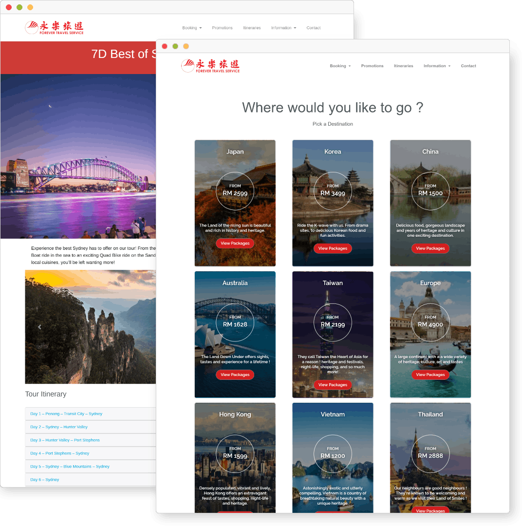 Forever Travel is one of the largest, award-winning travel agencies in Malaysia, and the largest in northern Malaysia with 6 branches. We were excited to work with them on their digital presence and online booking platform. Established since 1983, they had a bit of digital-catching-up to do!